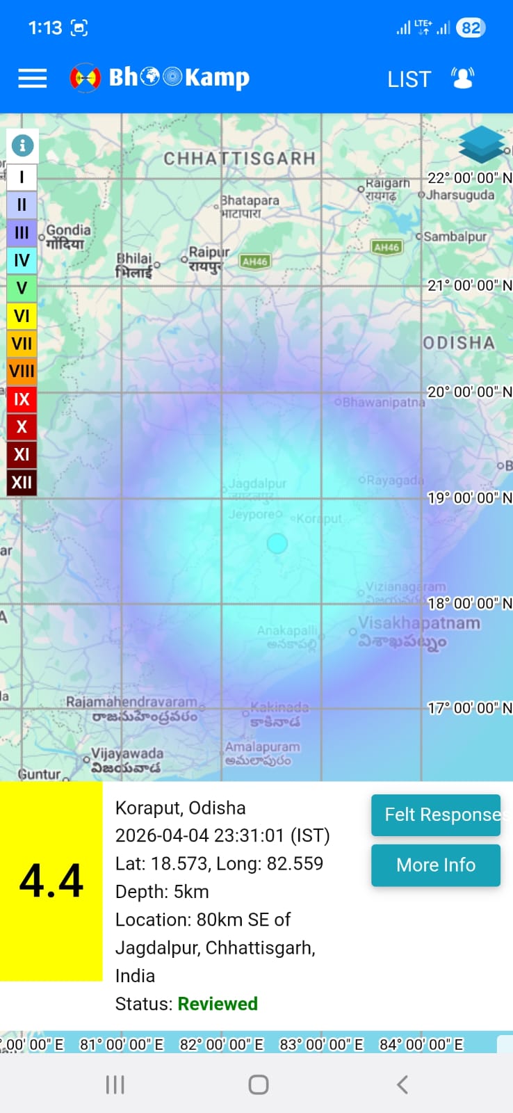 जानकारी के मुताबिक, भूकंप का केंद्र ओडिशा के कोरापुट जिले के पास था और इसकी तीव्रता रिक्टर स्केल पर 4.4 मापी गई।