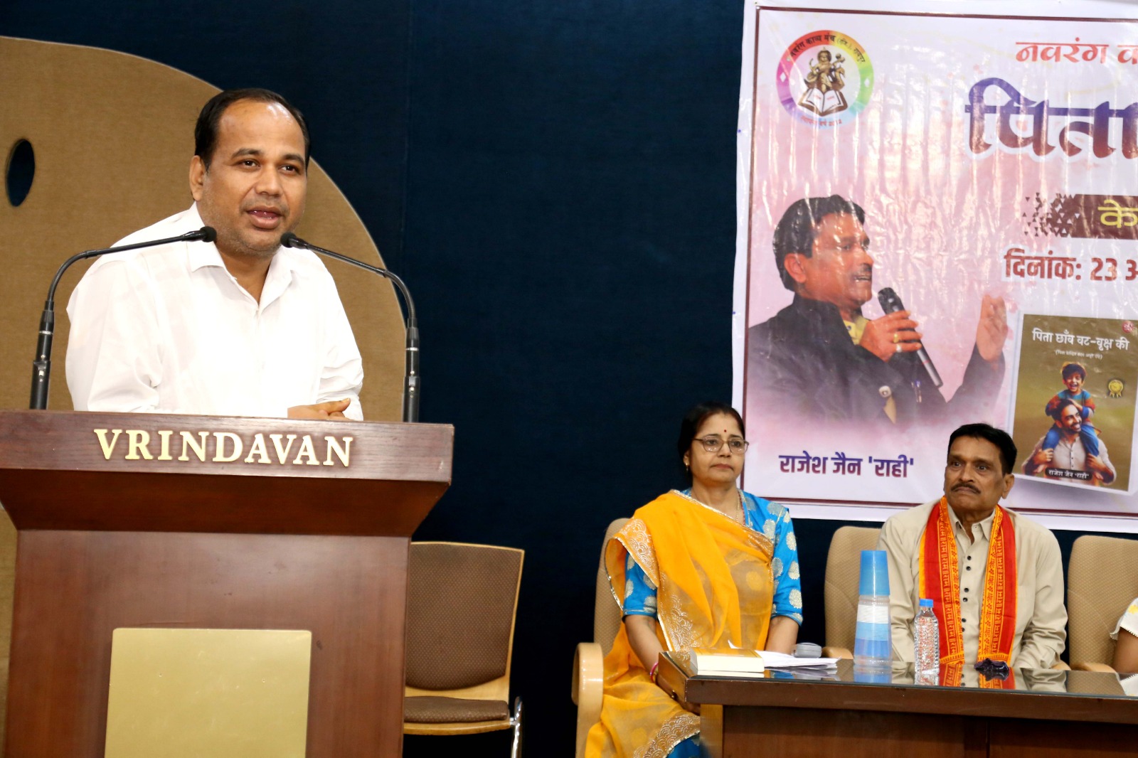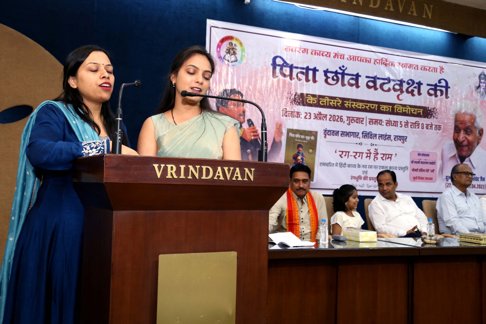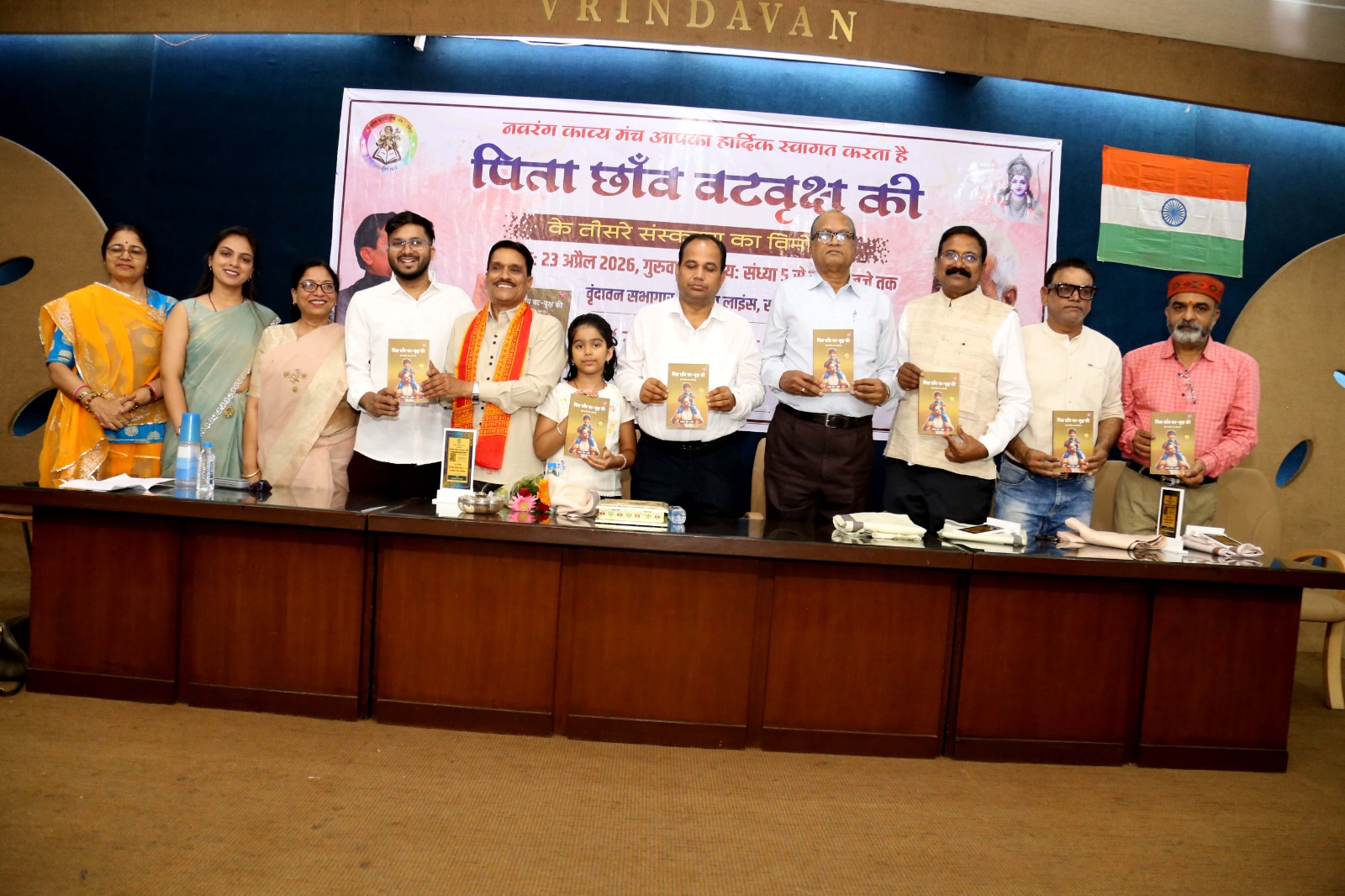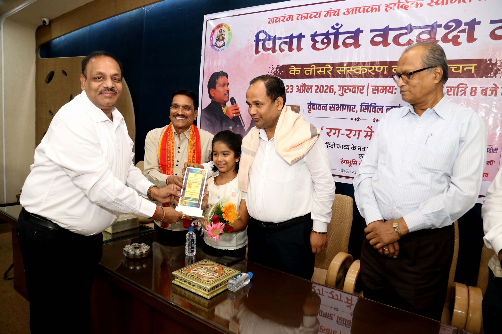 विश्व पुस्तक दिवस 23 अप्रैल के सुअवसर पर काव्य कृति ‘पिता छांव वट वृक्ष की’ के तीसरे संस्करण का विमोचन मुख्य अतिथि श्री गौरव कुमार सिंह आईएएस, कलेक्टर रायपुर, मुख्य वक्ता डॉ माणिक विश्वकर्मा ‘नवरंग’, युवा संस्था के संस्थापक एम.राजीव सर, प्रखर पत्रकार डॉ. अनिल द्विवेदी, रंगकर्मी आचार्य रंजन मोड़क, पारस जैन, प्रिया जैन, अनीता जैन के कर कमलों से संपन्न हुआ। सरस्वती वंदना नेहा जैन एवं प्रिया जैन ने प्रस्तुत की।