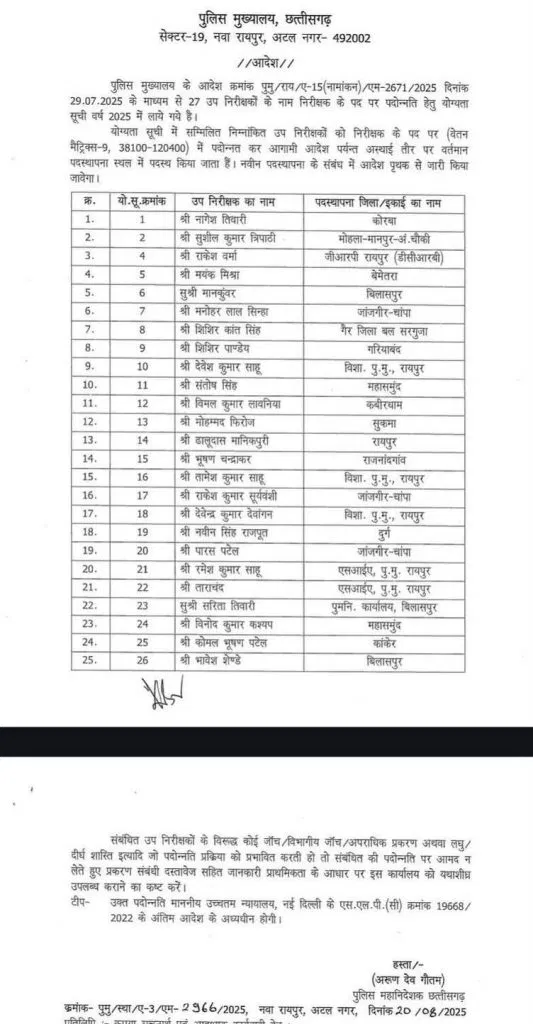 रायपुर । छत्तीसगढ़ पुलिस विभाग में पदोन्नति प्रक्रिया के तहत 25 सब इंस्पेक्टर (SI) को निरीक्षक (TI) के पद पर प्रमोशन दिया गया है। यह प्रमोशन वर्ष 2025 की योग्यता सूची के आधार पर किया गया है। आदेश पुलिस महानिदेशक (DGP) अरुण देव गौतम ने जारी किया।