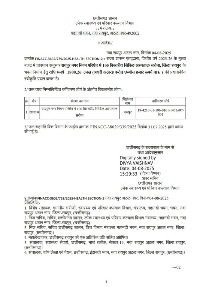 सरोना में प्रस्तावित 100 बिस्तरों वाला यह अस्पताल रायपुर पश्चिम विधानसभा क्षेत्र में स्वास्थ्य सेवाओं का नया केंद्र बनेगा। यह पहल छत्तीसगढ़ सरकार की जनहित में प्रतिबद्धता और प्रदेश के स्वास्थ्य ढांचे को मजबूत करने की दिशा में एक ठोस कदम है।