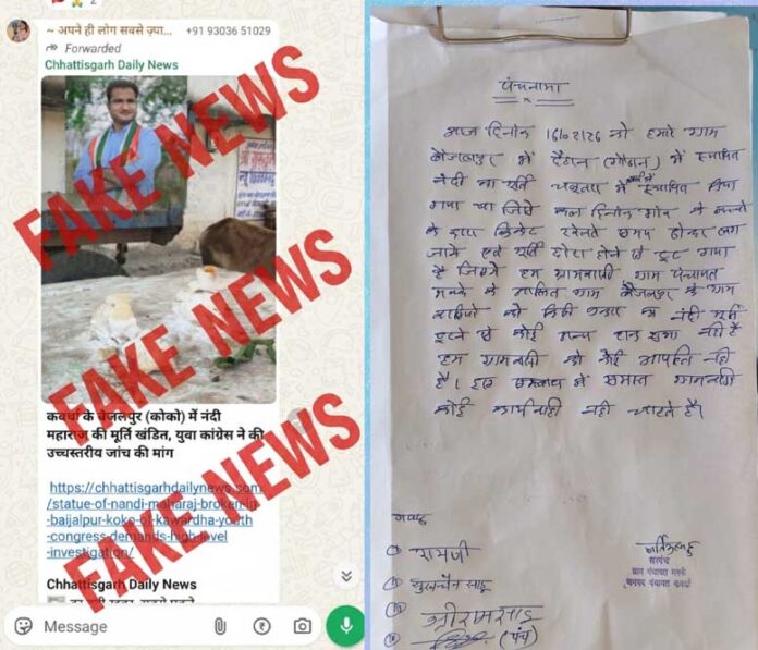 कवर्धा । जिले के ग्राम बैजलपुर (कोको) में नंदी महाराज की मूर्ति खंडित होने की घटना को लेकर सोशल मीडिया पर वायरल हो रहे भ्रामक समाचार और फर्जी वीडियो पर कबीरधाम पुलिस ने कड़ा रुख अपनाया है। पुलिस ने स्पष्ट किया है कि वायरल की जा रही जानकारी पूरी तरह तथ्यहीन है।