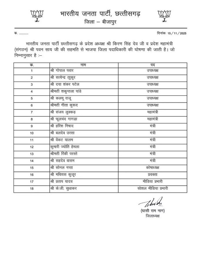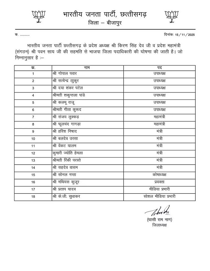 छत्तीसगढ़बीजापुर बीजापुर जिला बीजेपी में नई पदाधिकारियों की घोषणा By Akshay kumar Jaiswal - November 16, 2025 0 33 Share WhatsAppFacebookTelegramTwitterPinterestLinkedinReddItEmailTumblrMixVKDiggCopy URLKoo बीजापुर । भारतीय जनता पार्टी, छत्तीसगढ़ के प्रदेश अध्यक्ष किरणदेव सिंह एवं प्रदेश महामंत्री (संगठन) पवन साय की सहमति से भाजपा जिला पदाधिकारी की घोषणा की जाती है। Post Views: 32 WhatsApp Telegram Facebook Twitter LinkedIn Threads Messenger Print 0Shares