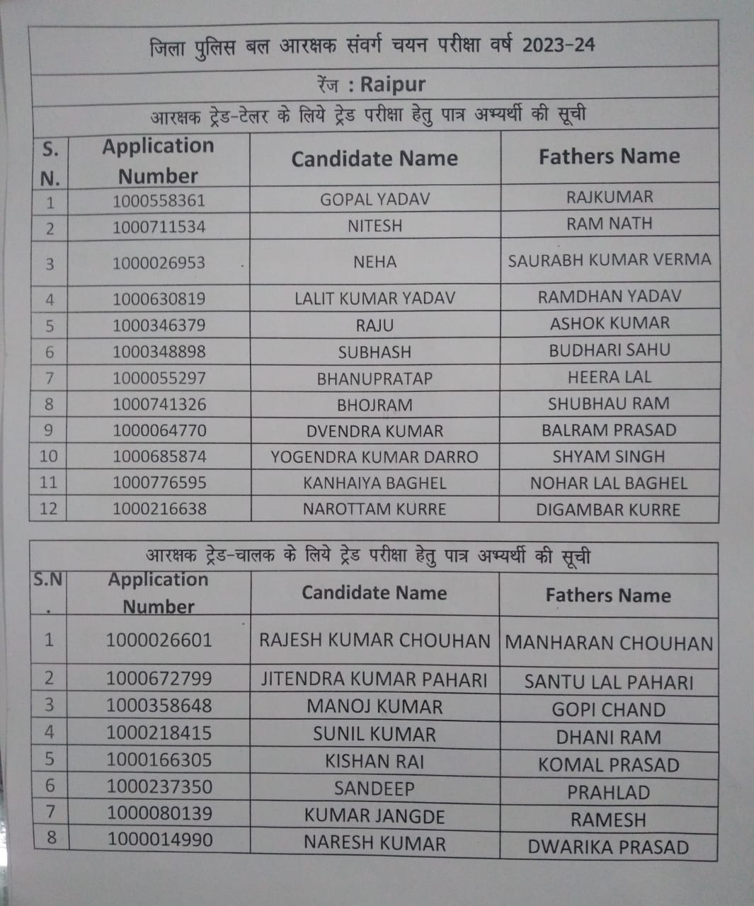 रायपुर जिला पुलिस बल आरक्षक संवर्ग भर्ती प्रक्रिया वर्ष 2023–24 रायपुर रेंज अंतर्गत जिला रायपुर हेतु आरक्षक भर्ती 2023–24 परीक्षा केन्द्र क्रमांक–1 पुलिस प्रशिक्षण विद्यालय माना–रायपुर में आरक्षक (चालक) एवं आरक्षक (ट्रेड टेलर) पद सम्मिलित अभ्यर्थी जो दस्तावेज़ जाँच, शारीरिक नापजोख, शारीरिक दक्षता परीक्षा एवं लिखित परीक्षा में सम्मिलित हुए थे,