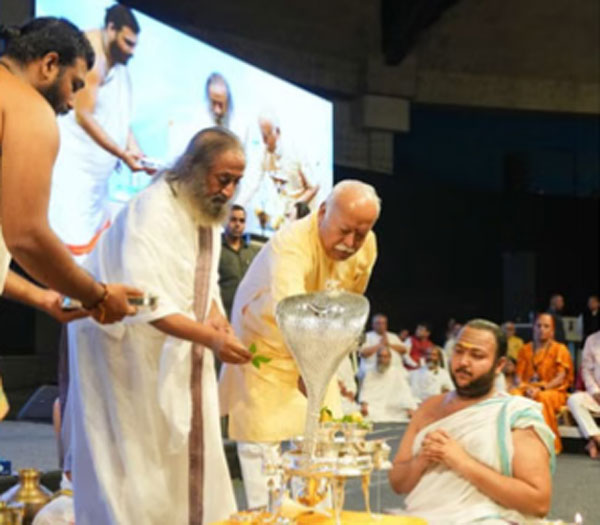 श्री श्री रविशंकर ने कहा कि डॉ. मोहन भागवत कर्मनिष्ठ और सेवा में समर्पित हैं। वे अपना पूरा समय देश-समाज के लिए देते हैं। उन्होंने कहा कि भागवत के मार्गदर्शन से करोड़ों लोग देशभक्ति और धर्म की स्थापना में लगे हैं। उन्होंने कहा कि आरएसएस पिछले सौ साल से देश की सनातन धरोहर को बचाने का काम कर रहा है, और यह कार्य आगे बढ़ते रहना चाहिए।