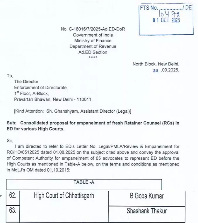 बिलासपुर, 15 अक्टूबर 2025 । प्रवर्तन निदेशालय (ED) ने छत्तीसगढ़ हाईकोर्ट में दो नए रिटेनर काउंसल की नियुक्ति की है। ED ने बी. गोपा कुमार और शशांक ठाकुर को हाईकोर्ट में वकालत की जिम्मेदारी दी है। अब ये दोनों ही उच्चतम न्यायालय में एजेंसी का पक्ष रखेंगे।