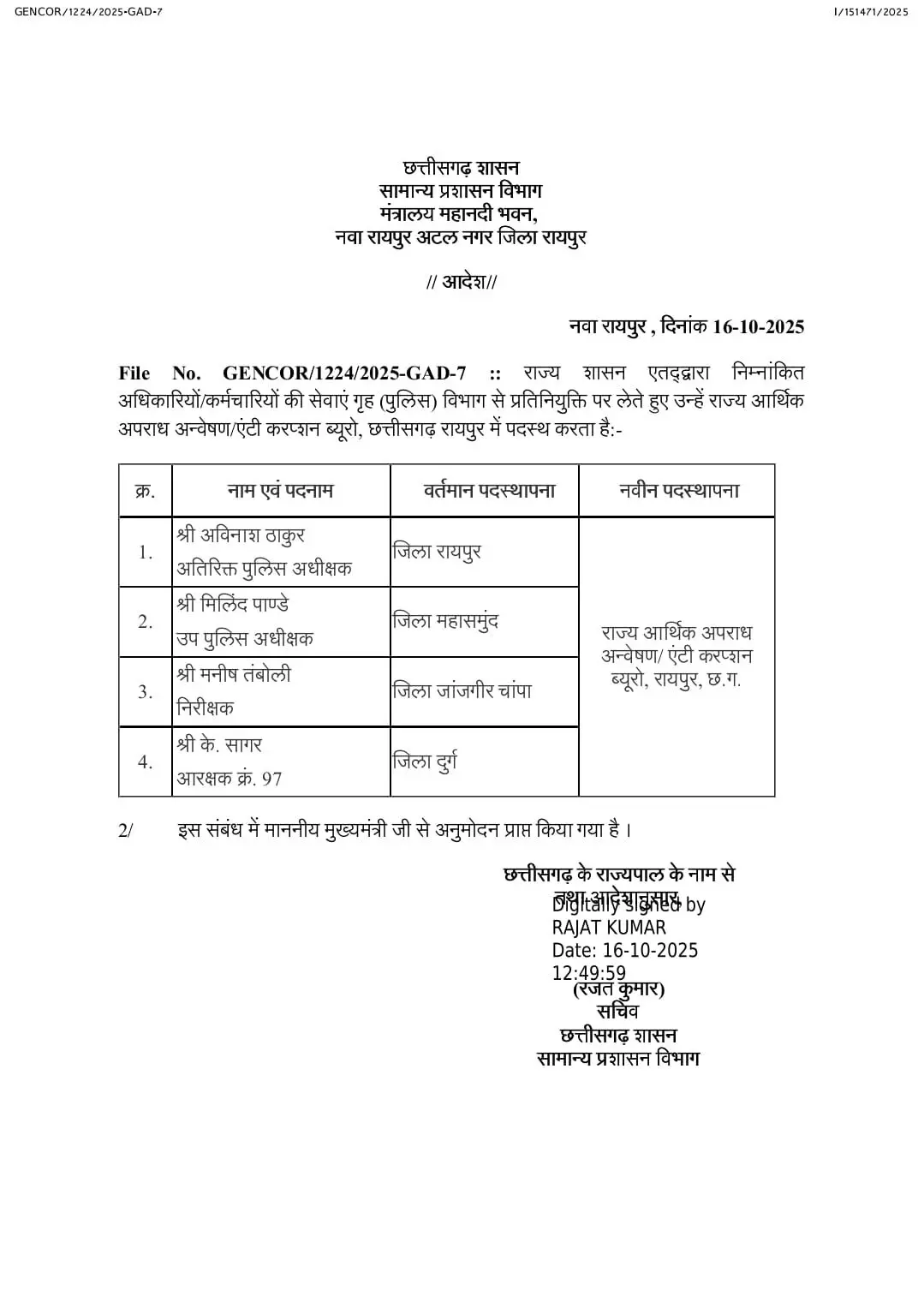 अविनाश ठाकुर, एएसपी रायपुर को एसीबी–ईओडब्ल्यू में प्रतिनियुक्ति पर पदस्थ किया गया है।