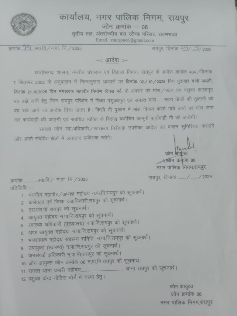 रायपुर । नगरीय प्रशासन एवं विकास विभाग के आदेशानुसार गांधी जयंती (2 अक्टूबर ) और महावीर निर्वाण दिवस (21 अक्टूबर) को रायपुर निगम परिक्षत्र में मांस-मटन बिक्री पर प्रतिबन्ध लगाया गया है। उक्त दिवस अगर किसी भी दुकान में मांस-मटन विक्रय करते पाए जाने पर यथोचित कानूनी कार्रवाई की जायेगी।