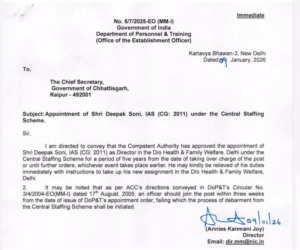 रायपुर । बलौदा बाजार कलेक्टर दीपक सोनी को भारत सरकार ने पोस्टिंग दे दी है। वे जल्द ही यहां से रिलीव होकर केंद्र में ज्वाईनिंग देंगे।