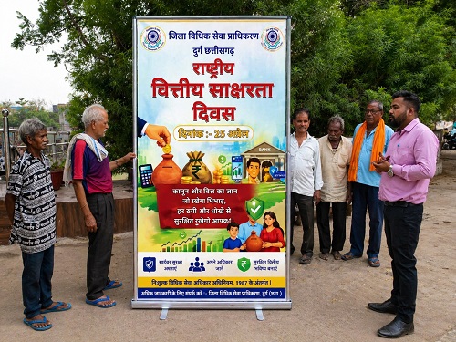 दुर्ग राष्ट्रीय वित्तीय साक्षरता दिवस के मौके पर जिले में जागरूकता का व्यापक अभियान चलाया गया। जिला विधिक सेवा प्राधिकरण की पहल पर आयोजित इस अभियान में पैरालीगल वॉलंटियर्स ने गांवों, शहरों और मोहल्लों तक पहुंचकर लोगों को वित्तीय और कानूनी जानकारी दी।