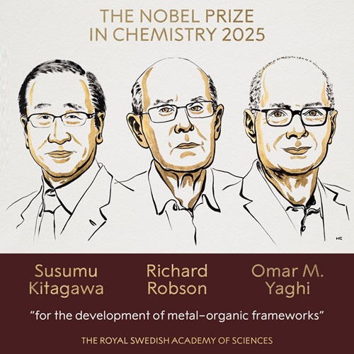 रॉयल स्वीडिश एकेडमी ऑफ साइंसेज ने सुसुमु कितागावा, रिचर्ड रॉबसन और उमर एम. याघी को “धातु-कार्बनिक ढांचे के विकास के लिए” रसायन विज्ञान में 2025 का नोबेल पुरस्कार देने का निर्णय लिया है। सुसुमु कितागावा जापान के क्योटो विश्वविद्यालय से हैं, रिचर्ड रॉबसन ऑस्ट्रेलिया के मेलबर्न विश्वविद्यालय से और अमेरिका के बर्कले स्थित कैलिफोर्निया विश्वविद्यालय से उमर एम. याघी हैं।