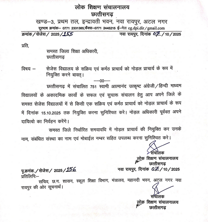 जिला शिक्षा अधिकारियों को जारी पत्र में डीपीआई ने लिखा है, सेजेस विद्यालय के सक्रिय एवं कर्मठ प्राचार्य को नोड़ल प्राचार्य के रूप में नियुक्ति की जानी है। यह नियुक्ति 15 अक्टूबर तक करनी होगी। प्रदेशभर के DEO के नाम जारी पत्र में लिखा है छत्तीसगढ़ में संचालित 751 स्वामी आत्मानंद उत्कृष्ट अंग्रेजी, हिन्दी माध्यम विद्यालयों के अकादमिक कार्यों के सफल एवं सुचारू संचालन हेतु आप अपने जिले के समस्त सेजेस विद्यालयों में से किसी एक सक्रिय एवं कर्मठ प्राचार्य को नोडल प्राचार्य के रूप में 15 अक्टूबर तक नियुक्ति करें।