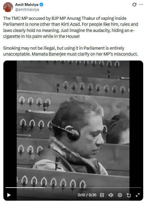 पर कीर्ति आजाद का एक वीडियो साझा कर लिखा- भाजपा सांसद अनुराग ठाकुर ने संसद के अंदर ई-सिगरेट पीने का आरोप जिस पर लगाया है, वो कोई और नहीं बल्कि टीएमसी सांसद कीर्ति आजाद हैं। उनके जैसे लोगों के लिए नियम और कानून का कोई महत्व नहीं है।