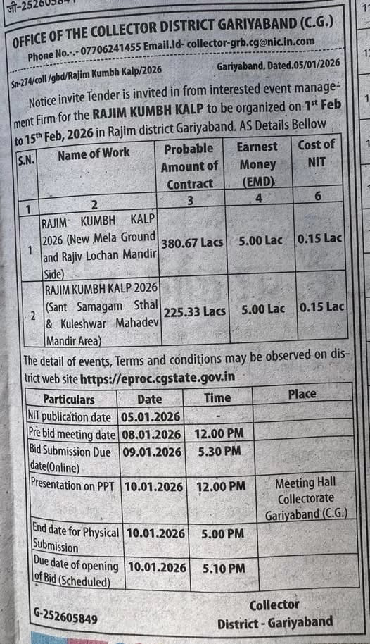 रायपुर । राजिम कुंभ कल्प 2026 के आयोजन से पहले ही टेंडर प्रक्रिया विवादों में घिर गई है। गरियाबंद कलेक्टर कार्यालय की ओर से करीब 6 करोड़ रुपये के इवेंट मैनेजमेंट कार्यों के लिए इमरजेंसी में जारी की गई निविदा पर पारदर्शिता को लेकर सवाल उठने लगे हैं। खास बात यह है कि इतने बड़े बजट के काम के लिए एजेंसियों को महज 4-5 दिन का ही समय दिया गया है।