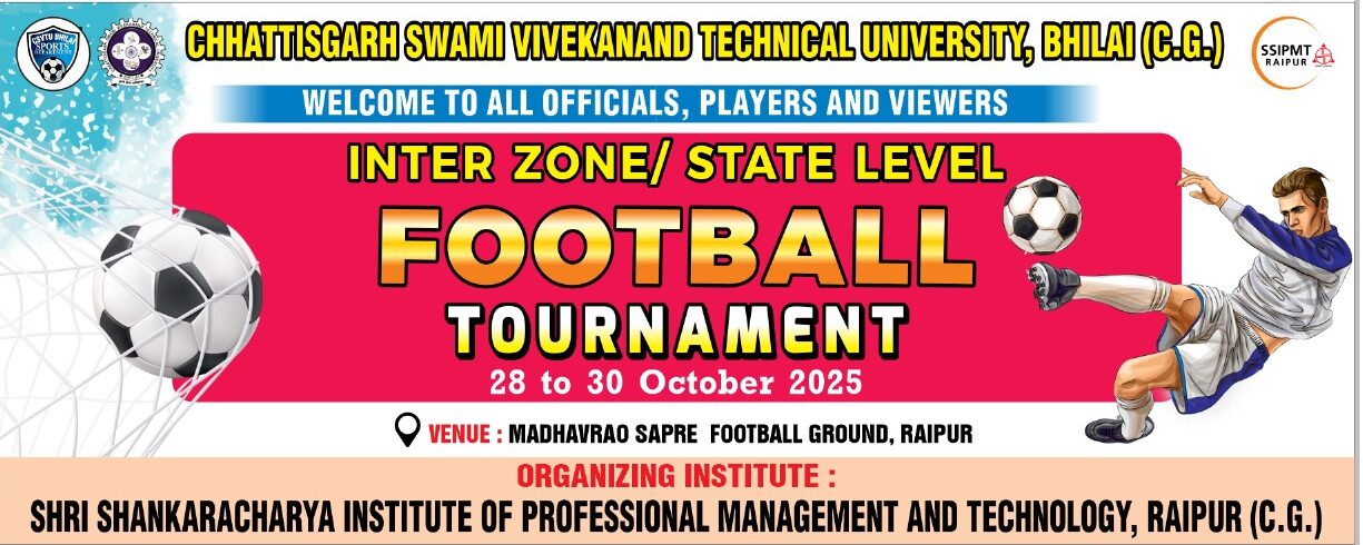 CSVTU,Bhilai के तत्वावधान में SSIPMT, Raipur द्वारा आयोजित राज्य स्तरीय फुटबाल पुरुष टूर्नामेंट के दूसरे दिन खिलाड़ियों ने बेहतरीन प्रदर्शन करते हुए दर्शकों का दिल जीत लिया। पहला मैच SOP, Bilaspur v/s GEC, Raipur के मध्य खेला गया जिसमें GEC, Raipur ने 1-0 से विजय प्राप्त की।