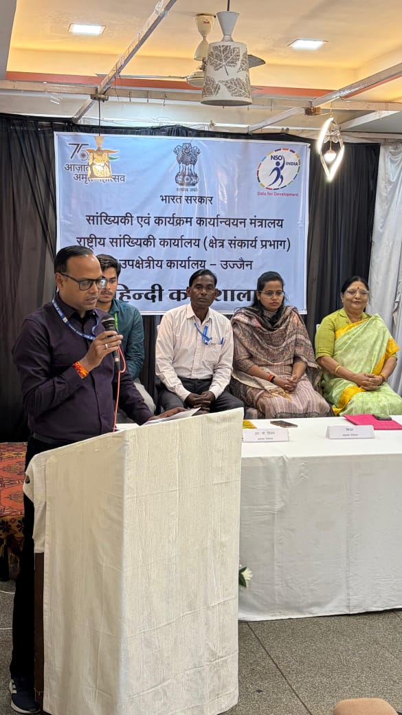 भारत सरकार के गृह मंत्रालय के राजभाषा विभाग के नियमानुसार सांख्यिकी एवं कार्यक्रम कार्यान्वयन मंत्रालय के राष्ट्रीय सांख्यिकी कार्यालय क्षेत्रीय कार्यालय ग्वालियर के अधीन उप-क्षेत्रीय कार्यालय उज्जैन द्वारा मंगलवार को ‘तिमाही हिन्दी कार्यशाला’ का आयोजन किया गया ।कार्यक्रम का शुभारम्भ किरन, सहायक निदेशक एवं रामगोपाल विजय, सहायक निदेशक, क्षेत्रीय कार्यालय ग्वालियर द्वारा डॉ. उमा वाजपेयी, पूर्व हिन्दी विभागाध्यक्ष, शासकीय कन्या स्नातकोत्तर महाविद्यालय, उज्जैन एवं प्रो. गीता नायक, सीनियर प्रोफेसर, हिन्दी अध्ययनशाला, विक्रम विश्वविद्यालय, उज्जैन का स्वागत कर किया गया।उक्त कार्यशाला में डॉ. उमा वाजपेयी द्वारा बताया गया कि कार्यालयों के अंतर्गत कामकाज में हिन्दी के उपयोग को बढ़ावा दिया जाना चाहिए। उन्होंने बताया कि भाषा की मानकता तय करना आवश्यक है क्योंकि भाषा एक बहते हुए पानी के समान है, उसकी धारा में शुध्दता भी बढ़ सकती है और अशुध्दता भी। भाषा की शुध्दता का पैमाना व्याकरण है। उन्होंने बताया कि बोली भी भाषा बन जाती है जब उसका साहित्यिक उपयोग होने लगे एवं व्याकरण सम्मत हो जाये। साथ ही प्रो. गीता नायक ने बताया कि हिंदी केवल एक भाषा नहीं, बल्कि भारत की सांस्कृतिक पहचान का महत्वपूर्ण अंग है।” यह हमारी भावनाओं, विचारों और परंपराओं को व्यक्त करने का प्रमुख माध्यम है। हमें हिन्दी के प्रयोग को बढ़ावा देकर अपनी परंपराओं और पहचान को सशक्त बनाना चाहिए ।कार्यशाला में क्षेत्रीय कार्यालय ग्वालियर, उपक्षेत्रीय कार्यालय उज्जैन, उपक्षेत्रीय कार्यालय रतलाम एवं उपक्षेत्रीय कार्यालय शिवपुरी के अधिकारियों एवं कर्मचारियों द्वारा प्रतिभाग किया गया।कार्यशाला का समापन सुनील परिहार, वरिष्ठ सांख्यिकी अधिकारी द्वारा कार्यक्रम के सफल आयोजन हेतु सभी अधिकारियों एवं कर्मचारियों का आभार व्यक्त कर किया गया।